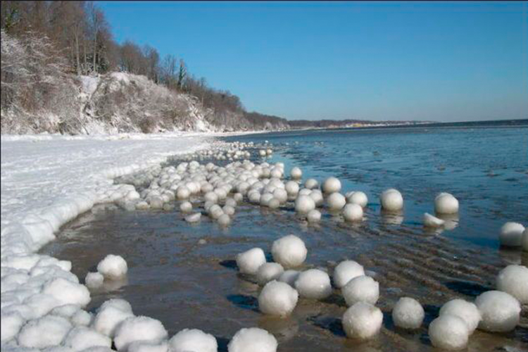 Bolitas heladas: es un fenómeno muy poco frecuente, ya que deben cumplirse una serie de condiciones para que se produzca. Después de intensas nevadas sobre los grandes lagos o mares, la nieve, combinada con temperaturas muy bajas y el movimiento de las olas semicongeladas, se puede convertir en bolas heladas de un diámetro que puede oscilar entre los 10 y los 40 cm. Cuando alcanzan la línea costera, pueden rodar empujadas por el viento y adquirir una forma esférica cada vez más perfecta gracias al rozamiento con el terreno, como si se tratara de cantos rodados.