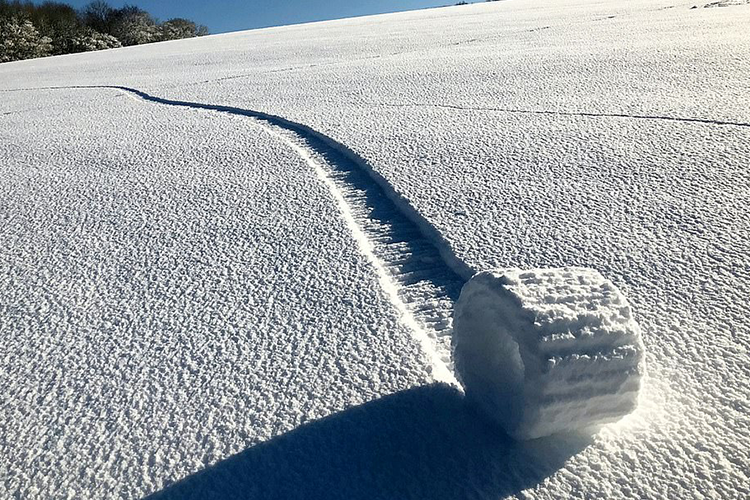 Rollitos de nieve: los trozos de nieve que caen de los árboles a la superficie pueden ser impulsados por el viento. Mientras van rodando, recogen más nieve por el camino. Más o menos es el mismo sistema que utilizamos para hacer un muñeco de nieve, pero, a diferencia de las bolas de los muñecos, los rollitos tienen forma cilíndrica y su interior está vacío. Como las capas internas son más finas, pueden rodar con mayor facilidad. Durante su recorrido, y si el viento es bastante fuerte, pueden llegar a medir más de medio metro. Pero no siempre que hay nieve y viento pueden formarse. Hace falta que la nieve de la superficie esté depositada sobre una capa de hielo sin llegar a adherirse y que el viento sea lo suficiente fuerte para impulsar el cilindro, pero no demasiado intenso, ya que podría hacerlo rodar muy rápido y se acabaría rompiendo. En Estados Unidos se organizan competiciones para encontrar el rollito más grande. En marzo del 2007, en las North Cascades del estado de Washington encontraron un ejemplar de 66 centímetros de diámetro con un vacío interior de 20 centímetros. Se debió de formar con la nieve que cayó de un árbol hacia la pendiente de la montaña. En este caso fue la gravedad y no el viento la que se encargó de transformarlo en este rollo gigante.